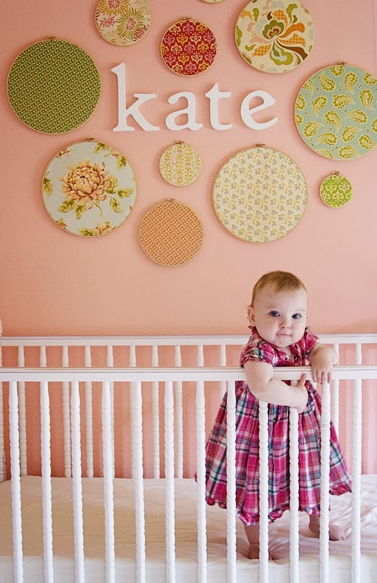 Back in 2010 I added fabric filled hoops to my "sewing room" and they remained there during the playroom revamp. We recently repainted the playroom and added functional storage in that space. I would love to reveal the new look, but that would require taking pictures! It did not take me long to decide where the hoops new home would be when I browsed my pin boards and saw these: